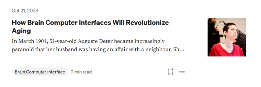 This article was the first time I started learning about Brain Computer Interfaces (BCIs) and I wrote about different BCIs that could be used to improve the quality of life of older adults. The article talks about current BCIs and how they can be applied to aging. Also, new and emerging technologies and how they could be used in the future. You can click on the photo above to read it.